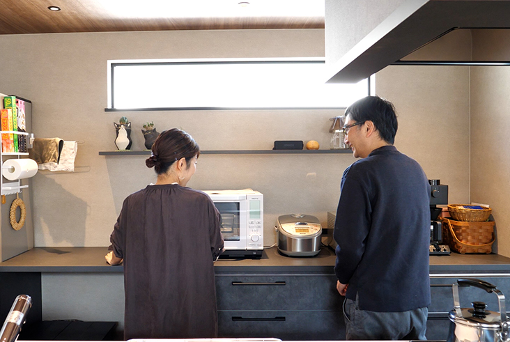 キッチンから眺められるガレージでは、車のガラスコーティングなどの作業や夫婦ともに操る大型バイクをメンテナンスできるまでの空間が。