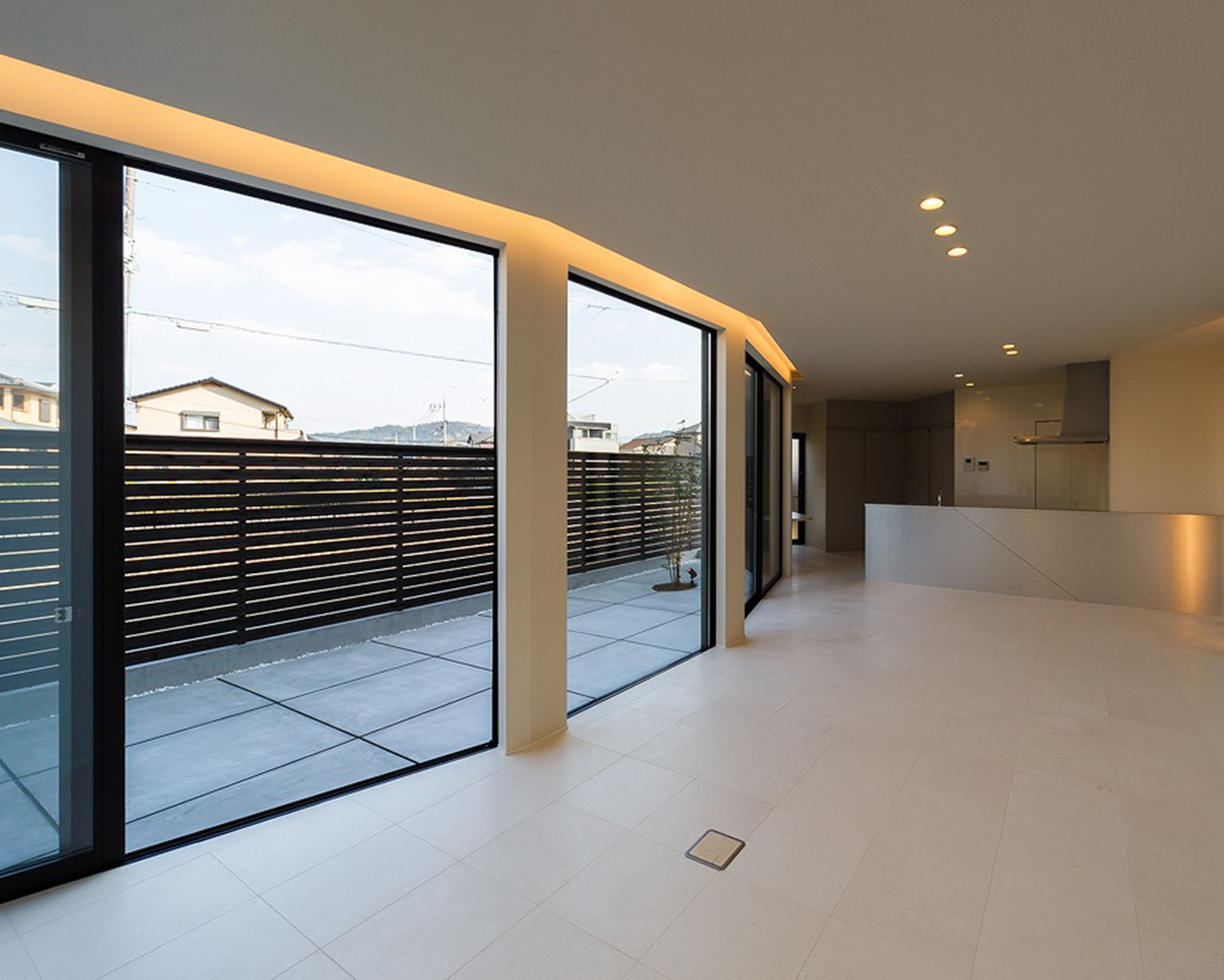 室内に入ればLDKと美しく調和するRの壁が、やわらかな空間を演出。