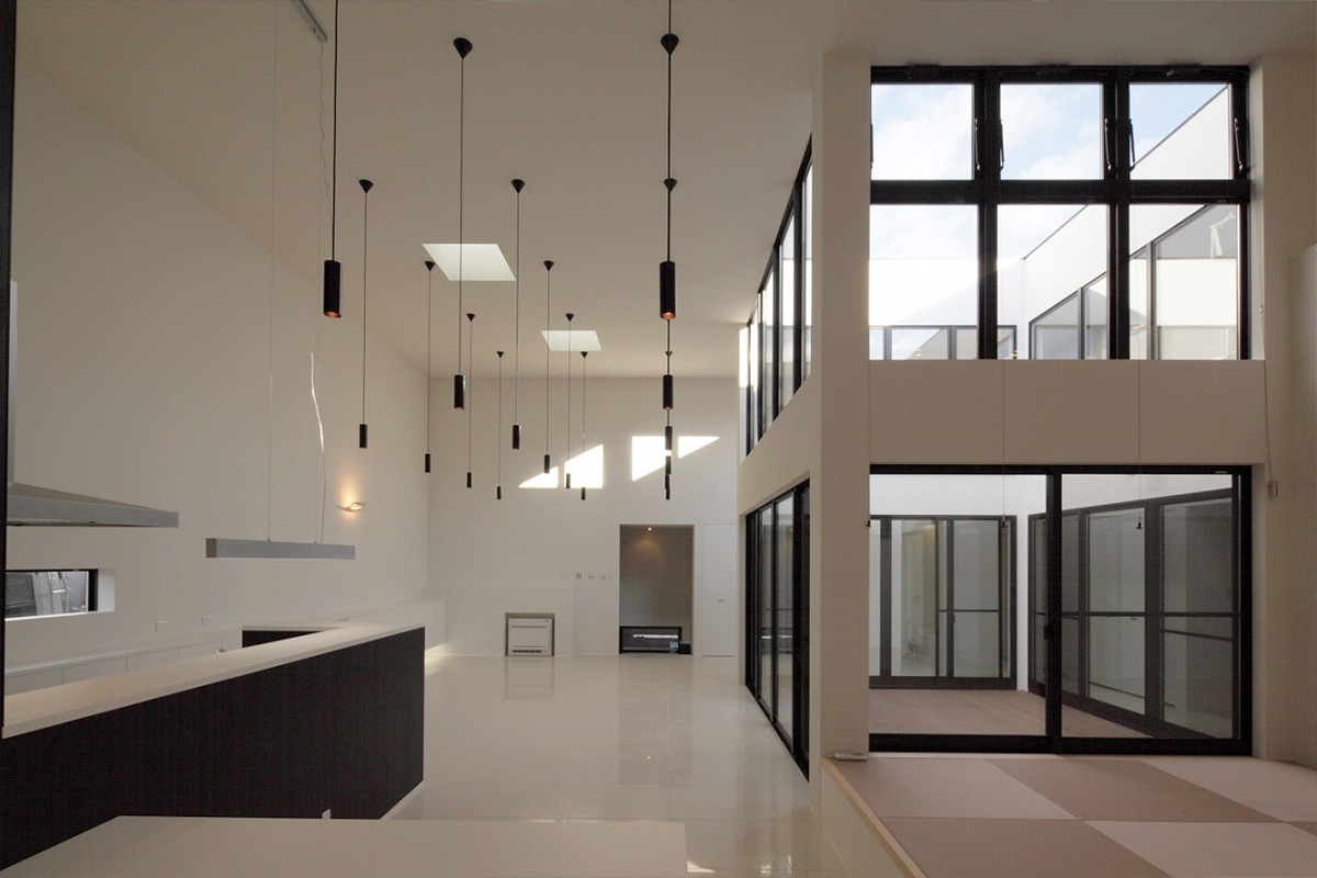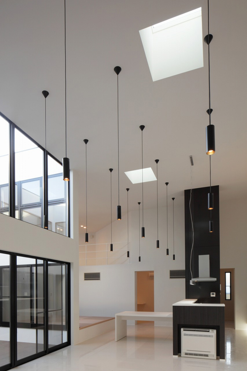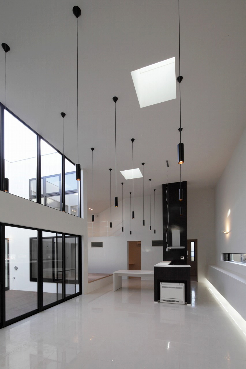 上部から降り注ぐ自然光が白を基調とした室内にやわらかく反射し、時間帯によって表情を変える光のグラデーションを生み出します。外部に開かずとも、空とつながる感覚を日常の中で味わえる設計です。