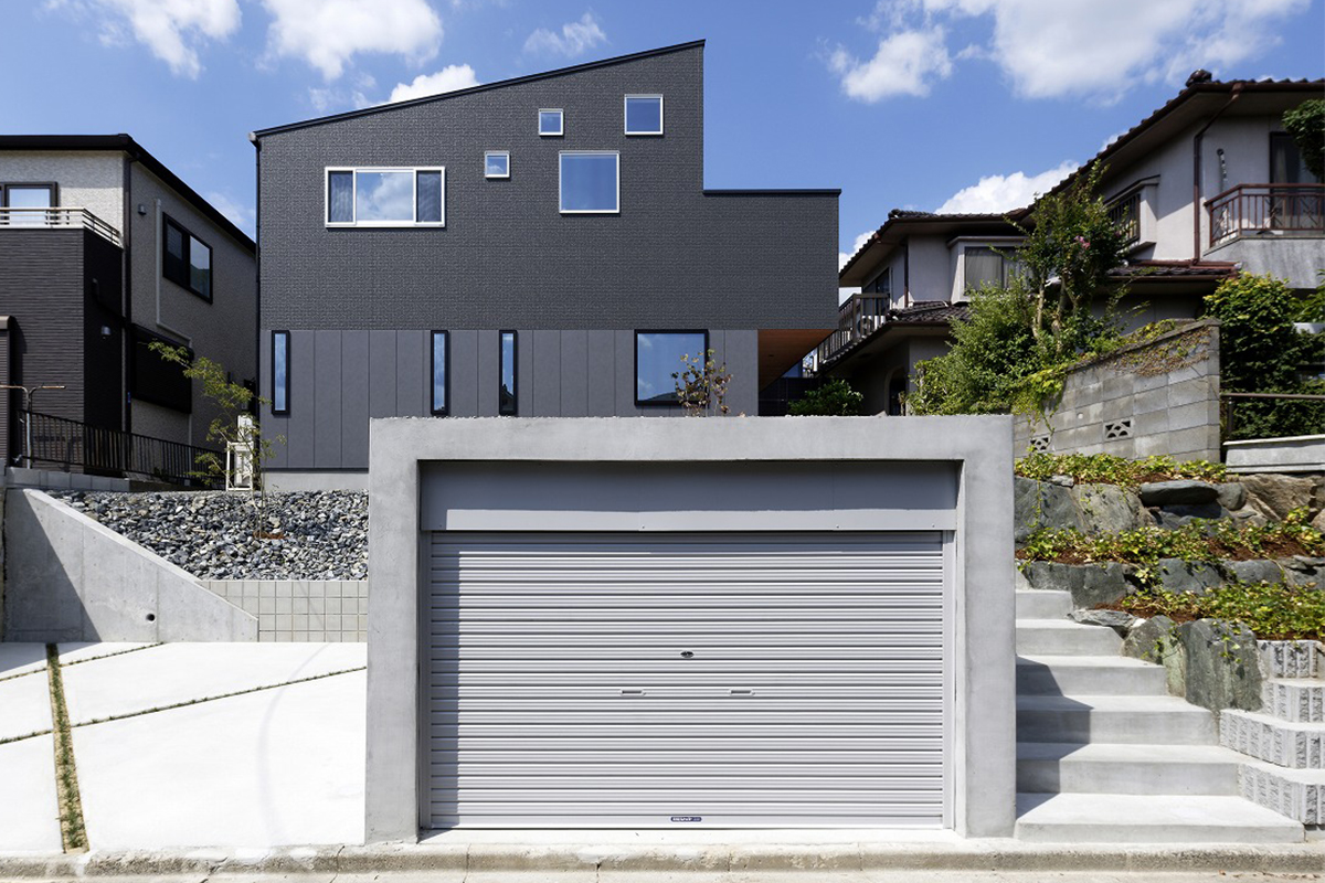 高低差のある敷地に残されていた石垣と既存ガレージを「石ガレージ」として再構成し、外構ごと生まれ変わらせた住まい。無駄な装飾をそぎ落としたシンプルな建物と調和するよう、ファサードは素材とプロポーションで魅せるデザインにまとめています。
