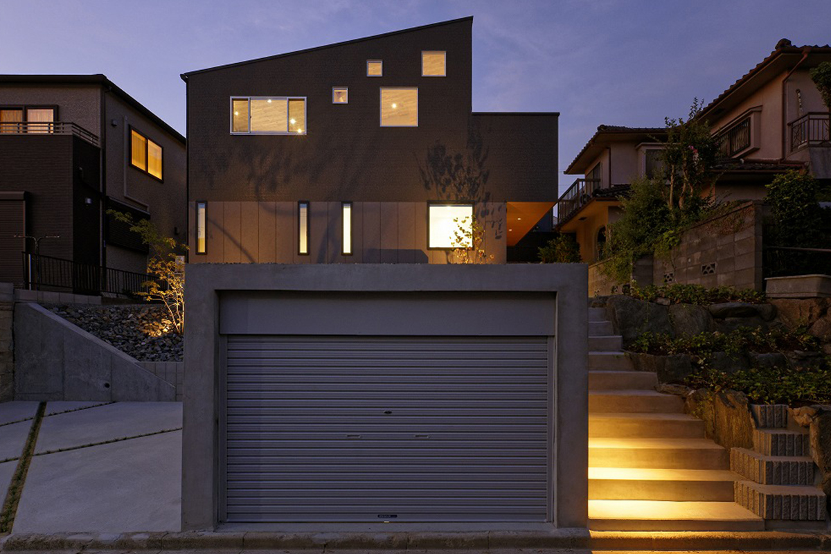 アプローチ階段やガレージ周りに照明計画を施し、夜には建物と石ガレージが柔らかく浮かび上がる印象的な景色をつくり出します。