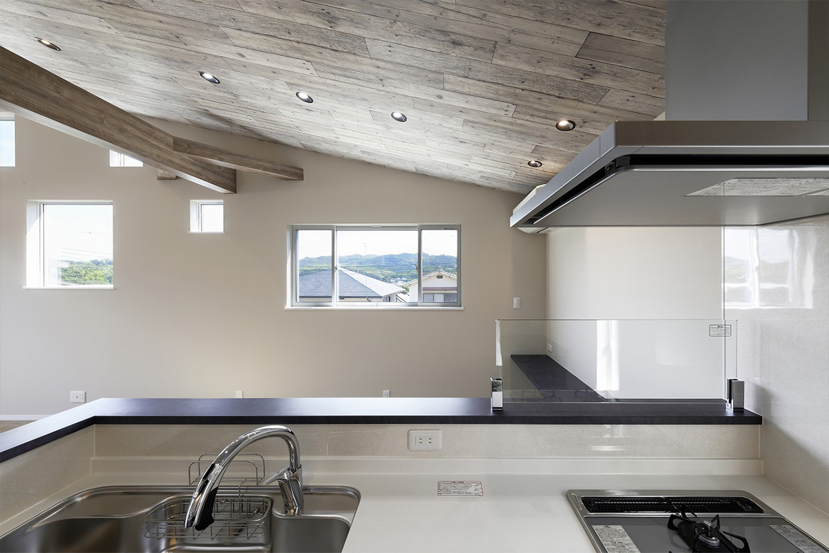 2階リビングからは周囲の街並みと山並みが広がり、窓の配置によって光の取り込み方にも変化を持たせています。外部との視線を適度にコントロールしながら、屋外テラスや動線の抜けによって開放感のある暮らしを実現した住まいです。
