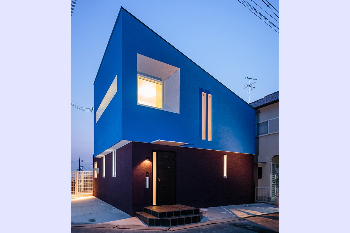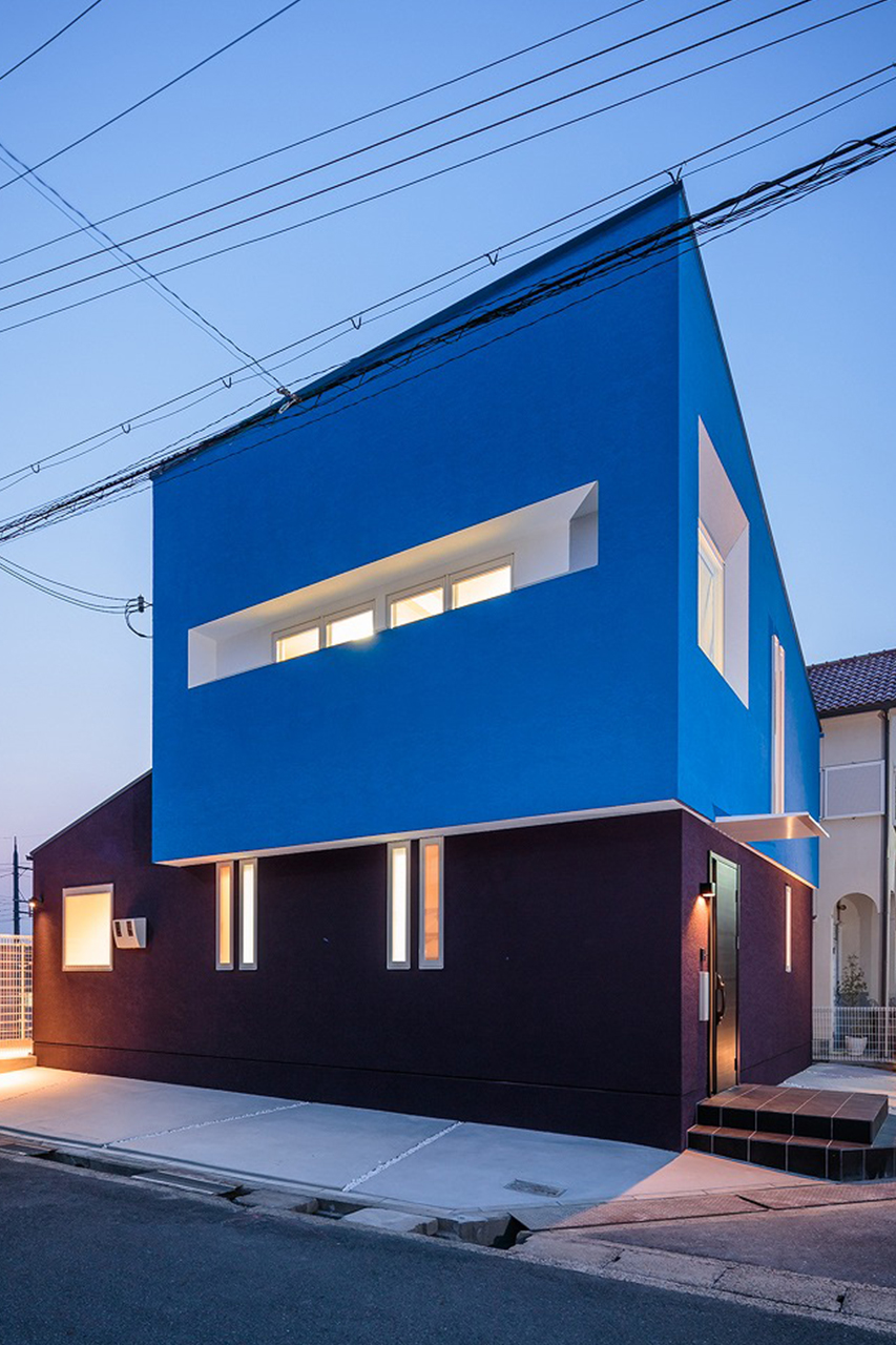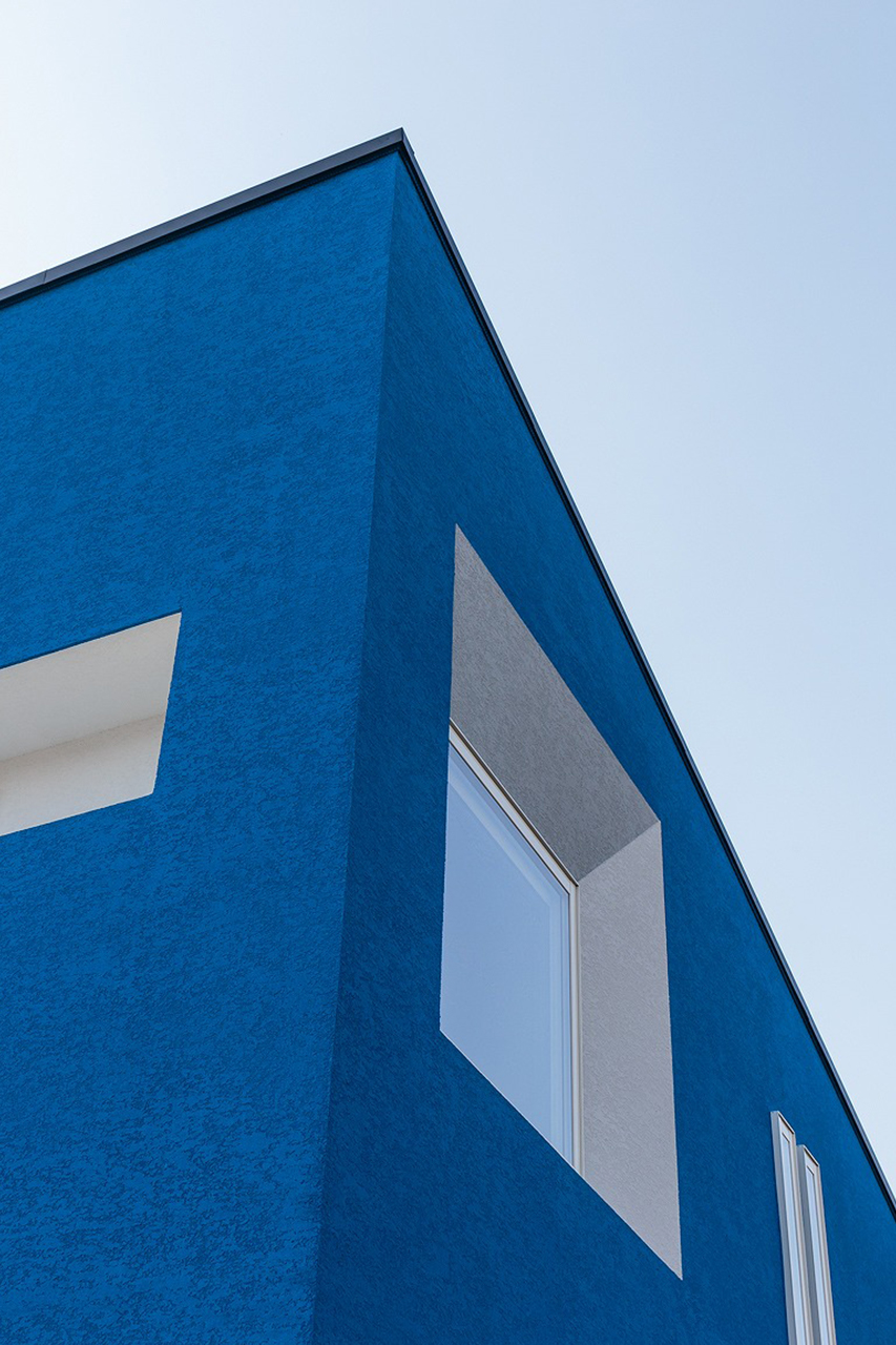 鮮やかなブルーの外壁は、見る位置や時間によって陰影が移ろい、まるで建物自体が立体的に浮き上がるような存在感を放ちます。