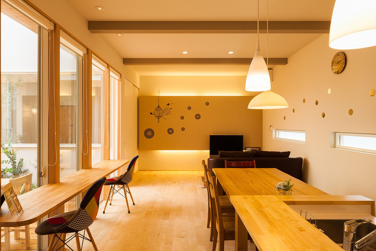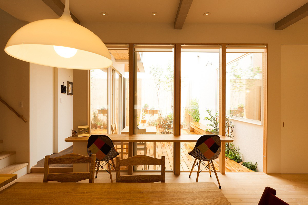 大きな掃き出し窓の向こうに中庭が広がり、四季の変化を感じながら食事や在宅ワークができる空間。