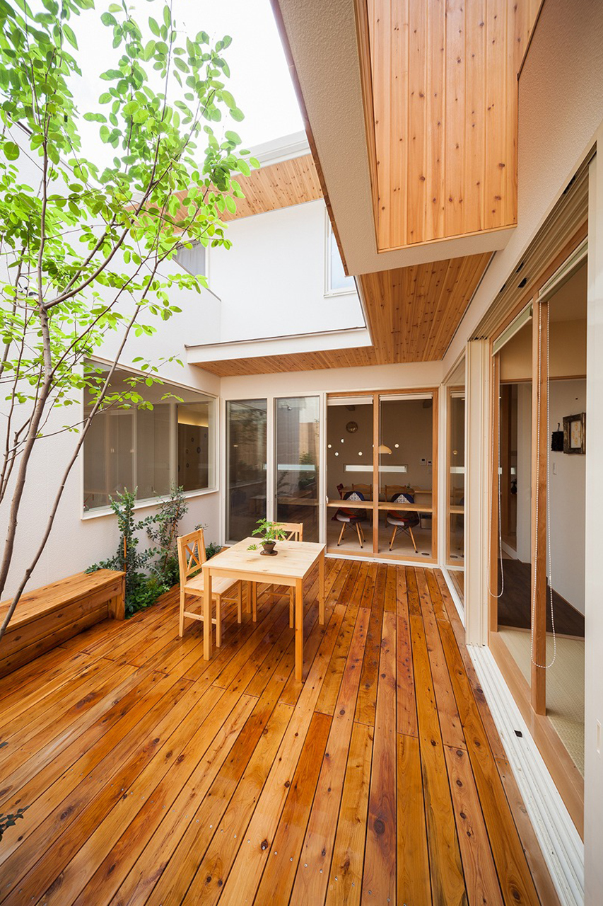 中庭にはウッドデッキとベンチを設け、内と外がつながる第二のリビングのようなスペースに。