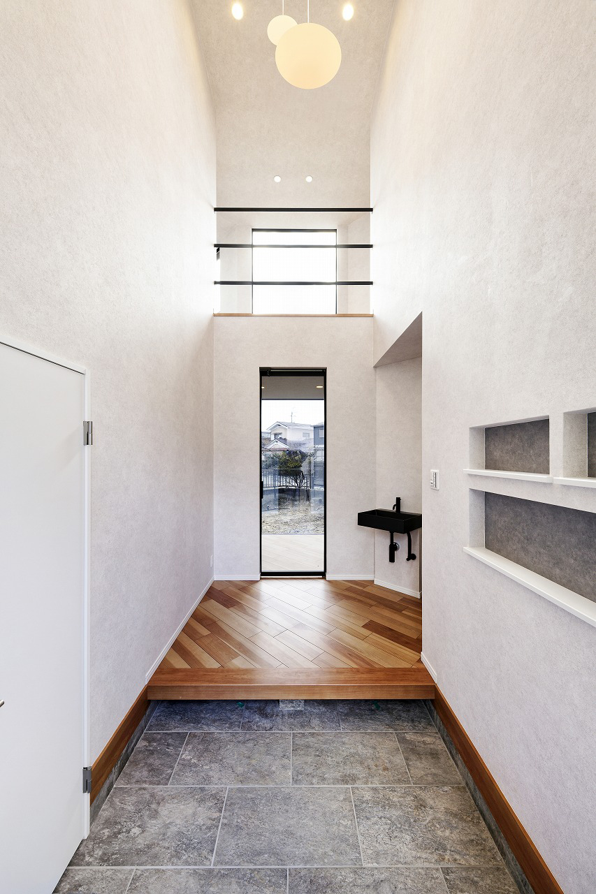 玄関ホールは吹き抜けのような縦の広がりをもたせ、来客を迎えるにふさわしい開放感のある空間に。