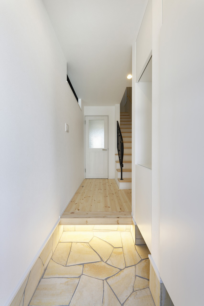 足元の間接照明が空間をやさしく照らし、帰宅時にほっと落ち着ける雰囲気を演出。