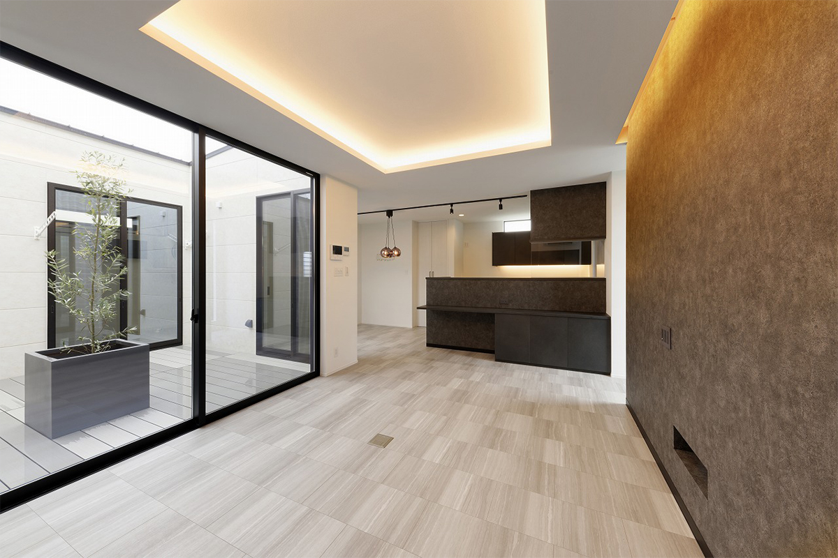 中庭から光を採り込む、大開口のLDK。