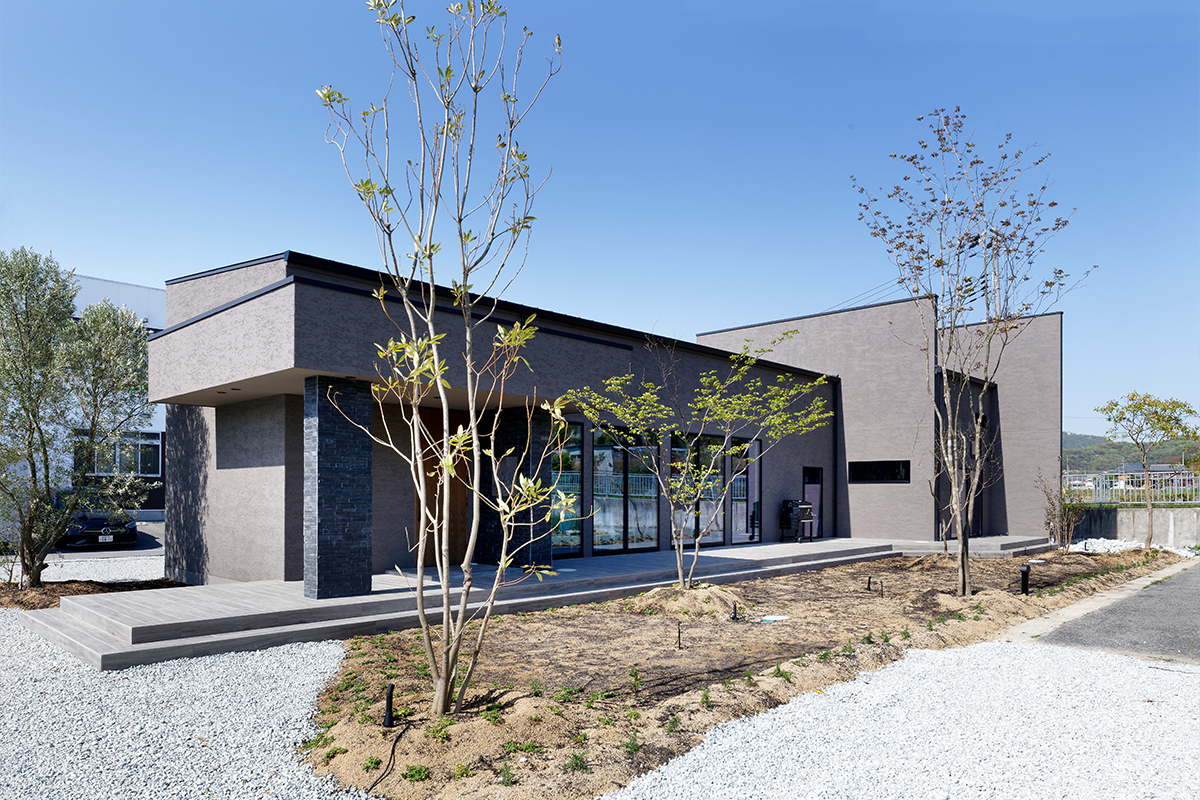 外観は存在感のあるフォルムと陰影のある外壁仕上げにより、一度見たら忘れられない印象的な佇まいに。